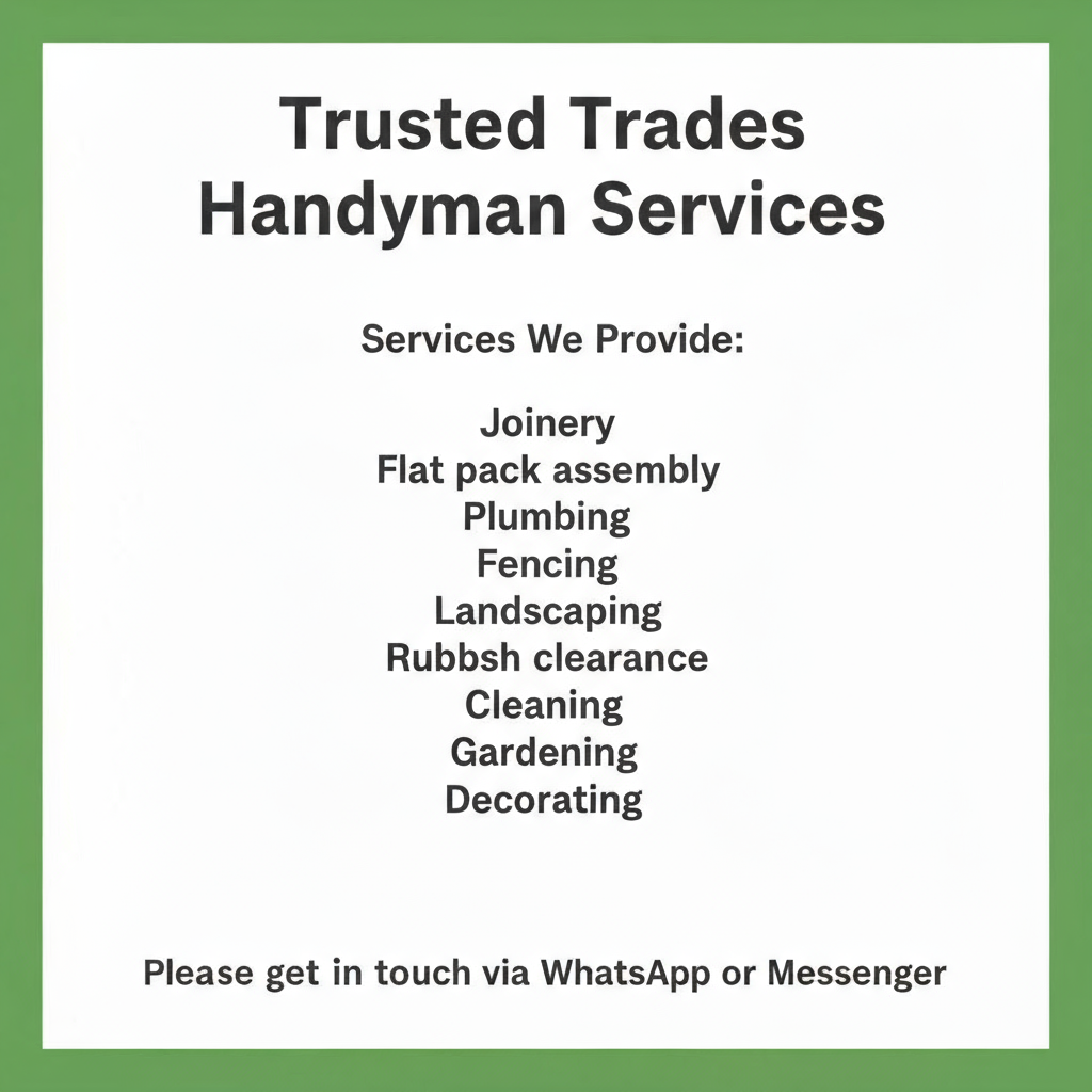 We handle a wide range of handyman tasks including joinery, flat-pack assembly, small plumbing jobs, fencing, landscaping, rubbish clearance, cleaning, gardening and decorating.